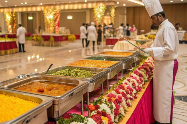 Customized wedding menus with traditional and modern cuisines, live counters, buffet setups, and hygienic food service for all guests.